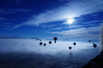 浪漫的土耳其,緩緩升空的熱氣球,清真寺的...
