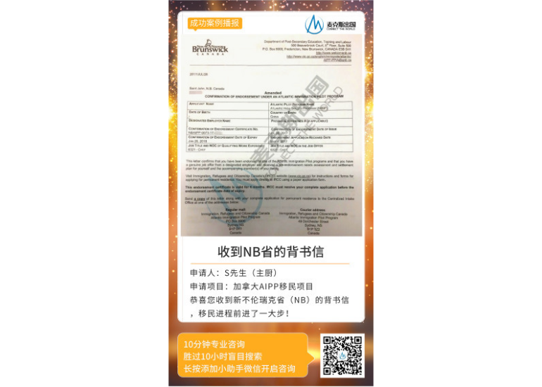恭喜S先生獲批NB省的背書信,向移民之路邁出了重要一步。