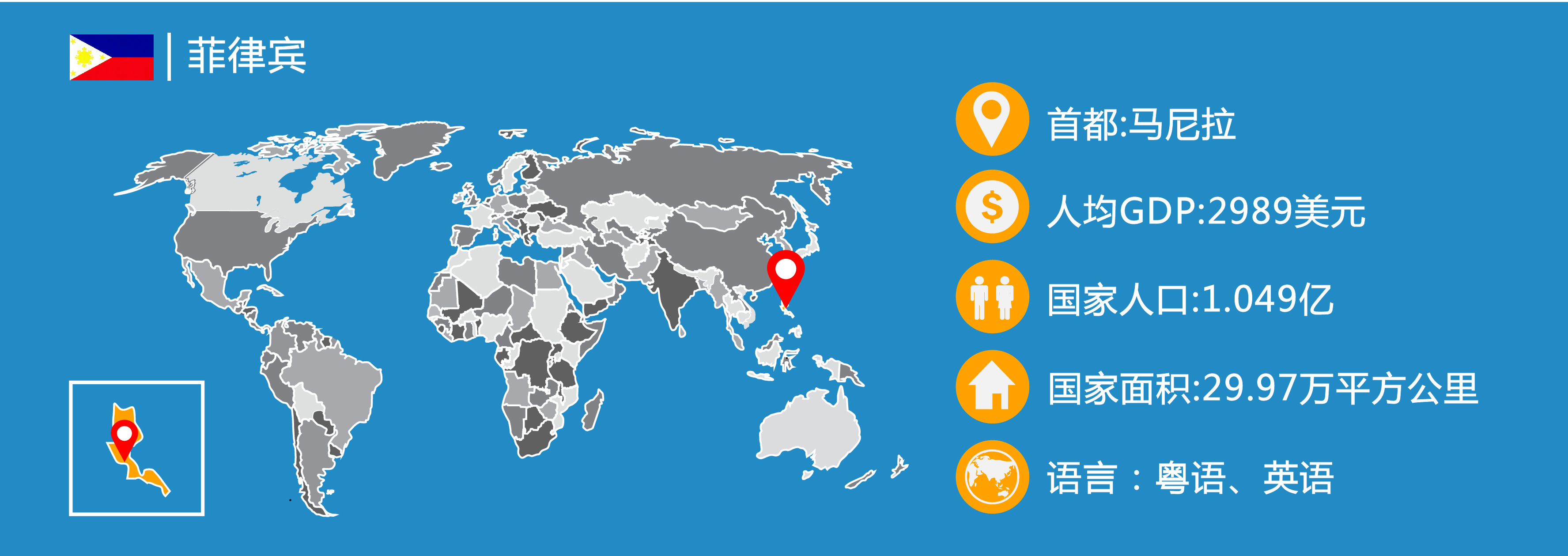 菲律賓共和國(他加祿語:Republika ng Pilipinas),簡(jiǎn)稱菲律賓,位于西太平洋,是東南亞一個(gè)多民族群島國家,面積29.97萬平方公里,人口1.049億(2017年)。