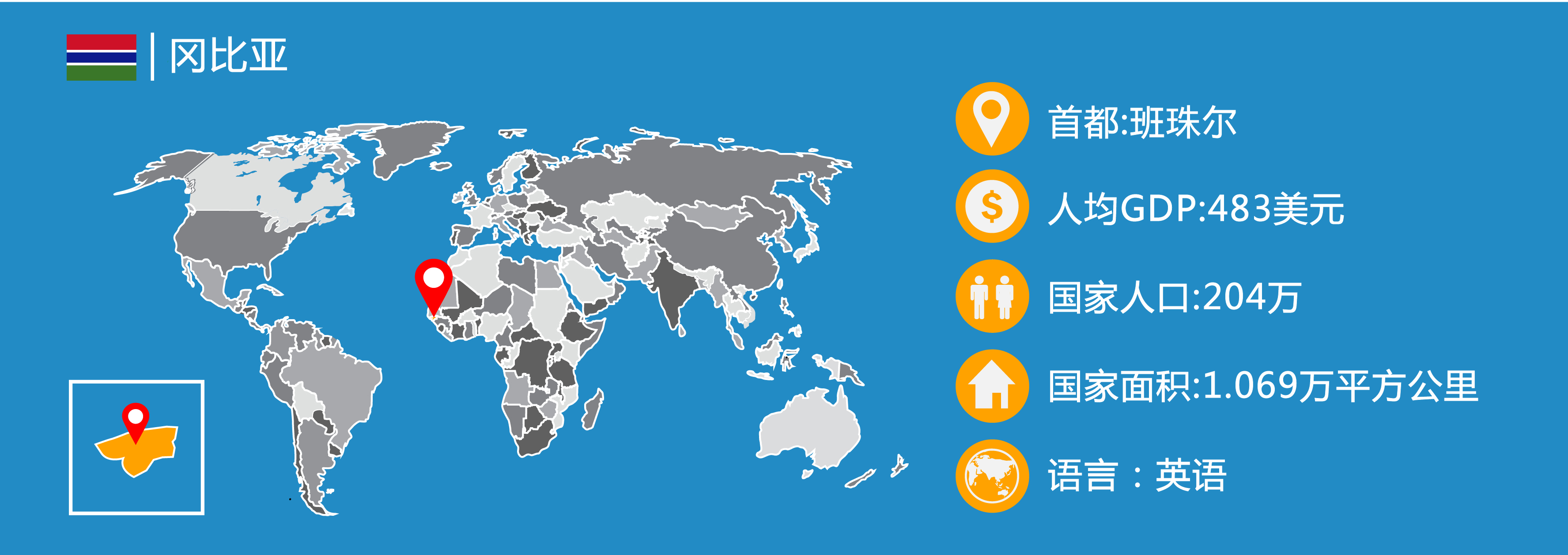 岡比亞共和國(簡稱:岡比亞,臺灣地區翻譯為“甘比亞”),位于北緯 13°28',西經 16°39',非洲西部大西洋沿岸地區,它西鄰大西洋,北、東、南三面被塞內加爾緊緊包圍,國土面積約為10690平方公里。