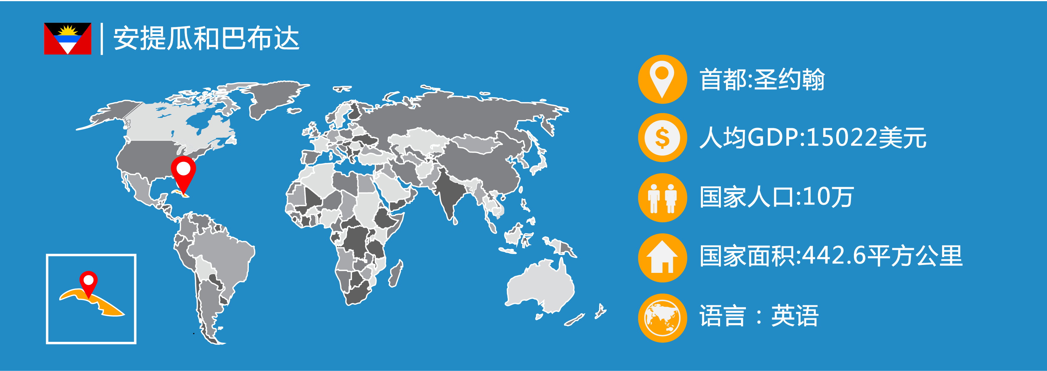 安提瓜和巴布達(dá)(Antigua and Barbuda),位于加勒比海小安的列斯群島的北部。為英聯(lián)邦成員國(guó)。絕大多數(shù)為非洲黑人后裔,多數(shù)居民信奉基督教。首都為圣約翰,總?cè)丝?0萬(wàn)(2016年)。安提瓜島的面積為280平方公里。巴布達(dá)島面積為160平方公里。安提瓜和巴布達(dá)島屬于熱帶氣候,年平均氣溫27℃。年均降水量約1020毫米。