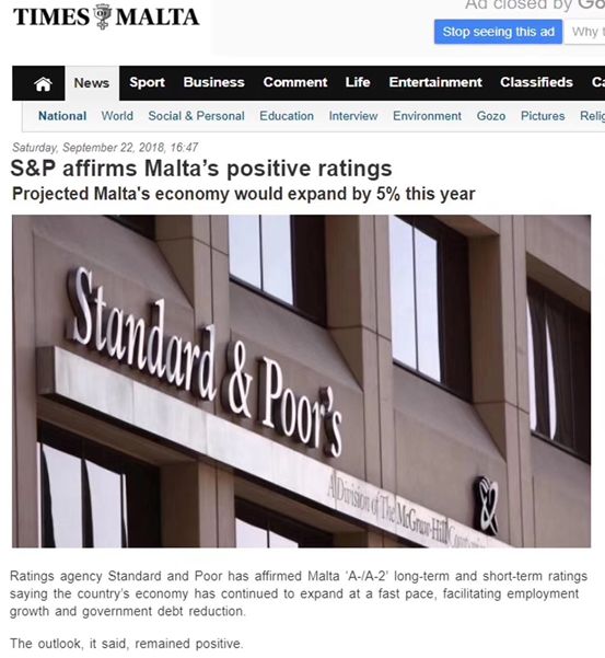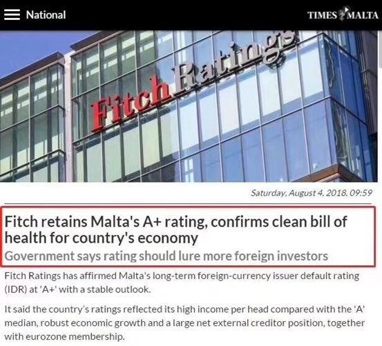 標準普爾將馬耳他國債上調至A2,DBRS評級中馬耳他在歐元區里GDP增速第一名,惠譽國際A+。
