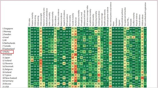 素有“照亮醫界的明窗”之美譽的,醫學界著名的行業內部雜志“柳葉刀”(The Lancet.)近來發表的年度健康相關指數中,馬耳他醫療領域在195個國家中脫穎而出,排名全世界第9。此次評估中,馬耳他的表現比去年提高了5位,在評估的10個指標中獲得滿分,在28個領域獲得80分,總體平均分79分。