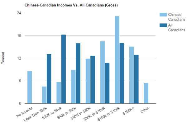 華人群體最突出的收入檔次在10萬-15萬之間(23.2%),其次是8萬-10萬檔之間和15萬+檔次。整體上來說,加拿大華人年收入檔次普遍偏高。