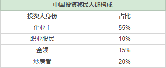 從統計表中可以看出,企業主是中國投資移民人群中的主要組成部分,占了55%的比重。而且根據調查這些投資移民多是千萬級的富豪!