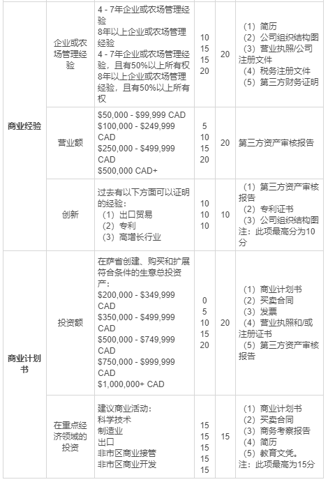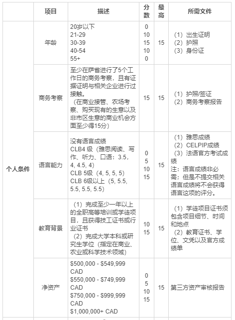 以薩省為例,薩省的企業家移民項目必須在EOI評分中獲得75分,之后才能通過篩選和相關審核后申請人先取得工作簽證,持工作簽證到薩省進行創業,滿足政府創業要求后可以申請省提名,最后獲得加拿大永久居民身份。 加拿大薩省企業家移民EOI評分標準表格:
