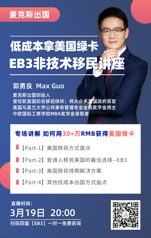 Max Guo(郭勇良)——麥克斯出國的創(chuàng)始人!Max是著名的低成本移民專家,曾擔任全美知名移民律師助理,美國EB3移民領域知名自媒體,回國后創(chuàng)辦麥克斯出國,服務客戶遍及全球10余個國家和地區(qū)、大陸24省40多個城市,具有豐富的移民知識理論和實踐經(jīng)驗。