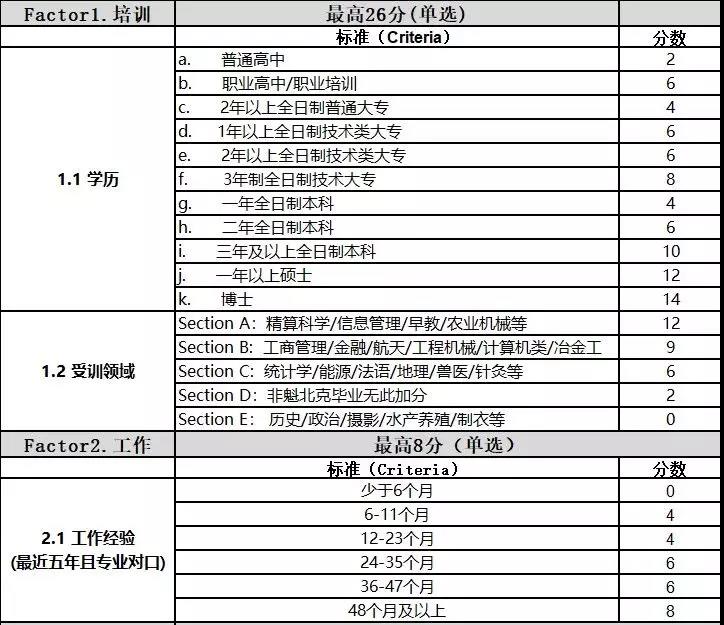 開聊前我們先做一個簡單的打分:按照移民政策,有無魁省留學經驗在打分上會有一些差別,保守起見,我們默認申請人沒有魁省本地大學的文憑,把整個打分表劃分為9個小部分:
