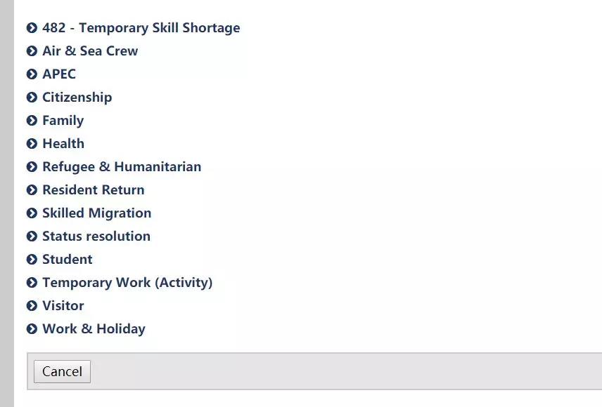 點擊進入網址,根據個人需求選擇簽證類型。點擊相應目的即可看到相關類型簽證信息。