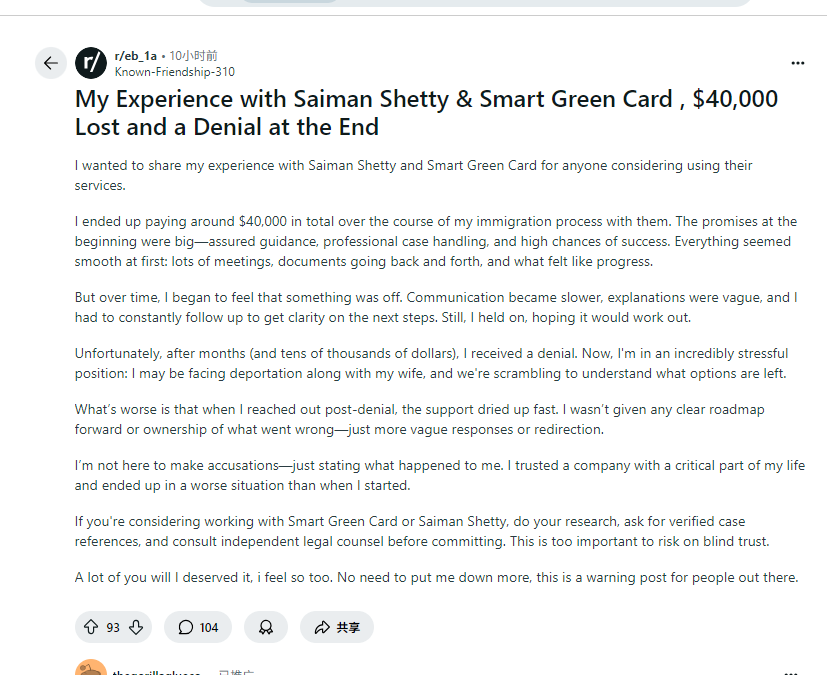 最近刷Reddit的時候,看到一篇帖子,內容說實話挺震撼的。 原帖是這樣的,有個在美國工作多年的技術背景申請人,原本打算沖一把EB1A,找了一家移民公司,結果被坑了四萬美元,最后不僅申請被拒,甚至有可能被遣返。