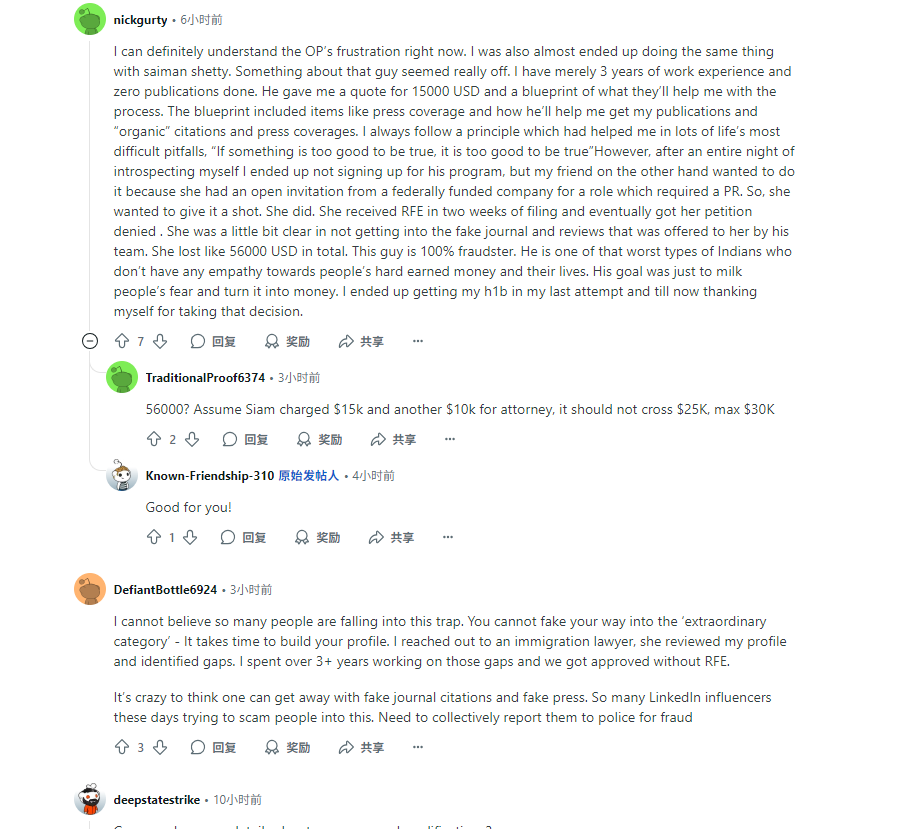 評論區還有人補充說,現在不少所謂的“EB1A服務公司”,其實就是專門搞灰產的,打著“數據堆積”和“戰略規劃”的旗號,實則在給申請人偽造材料,甚至偽造評審郵件、偽造推薦信、代寫科研成果。